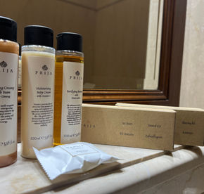 Il bagno è dotato di Linea di cortesia previlegiata, scelta apposta per te, e di un kit selezionato per il tuo benessere.